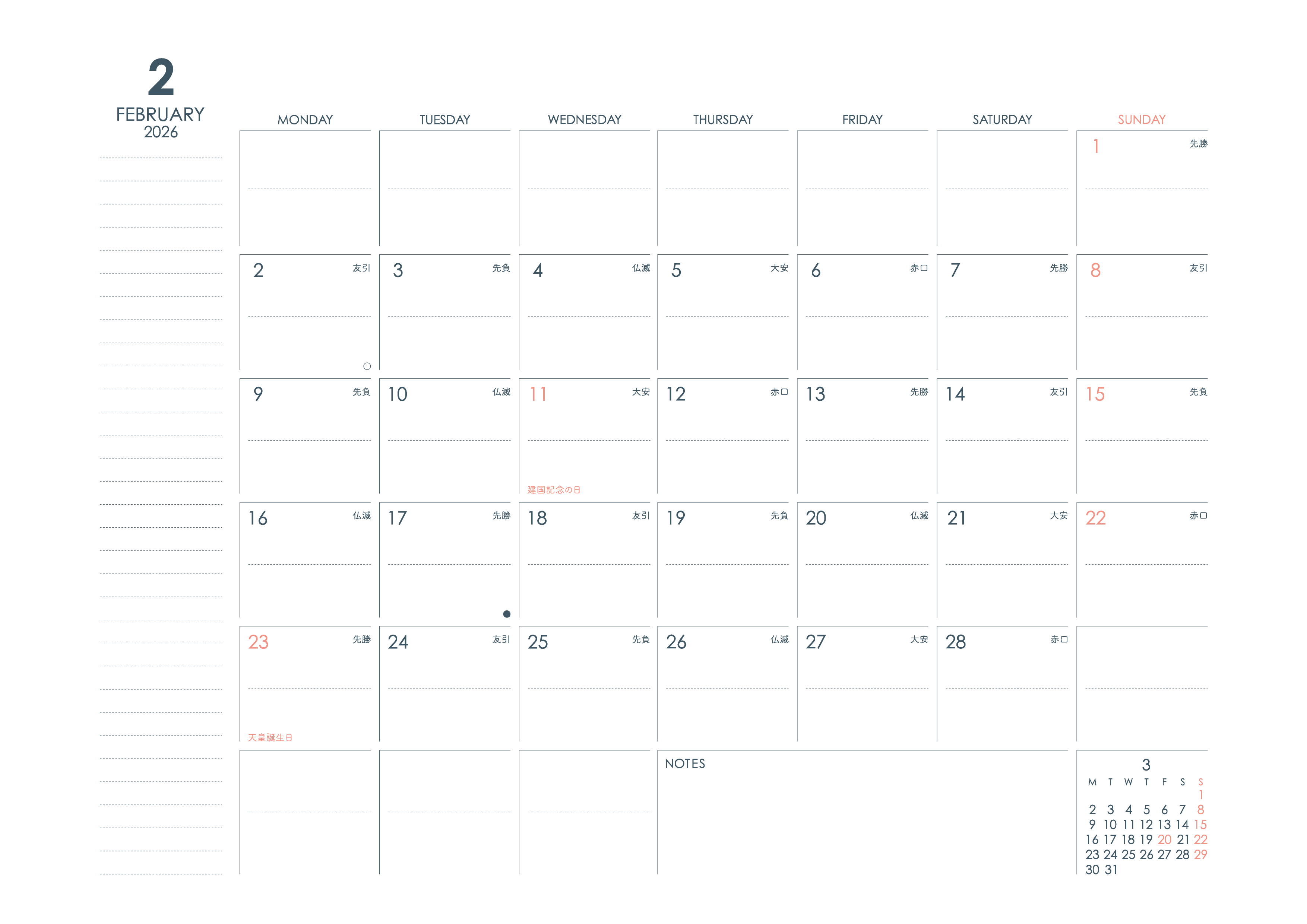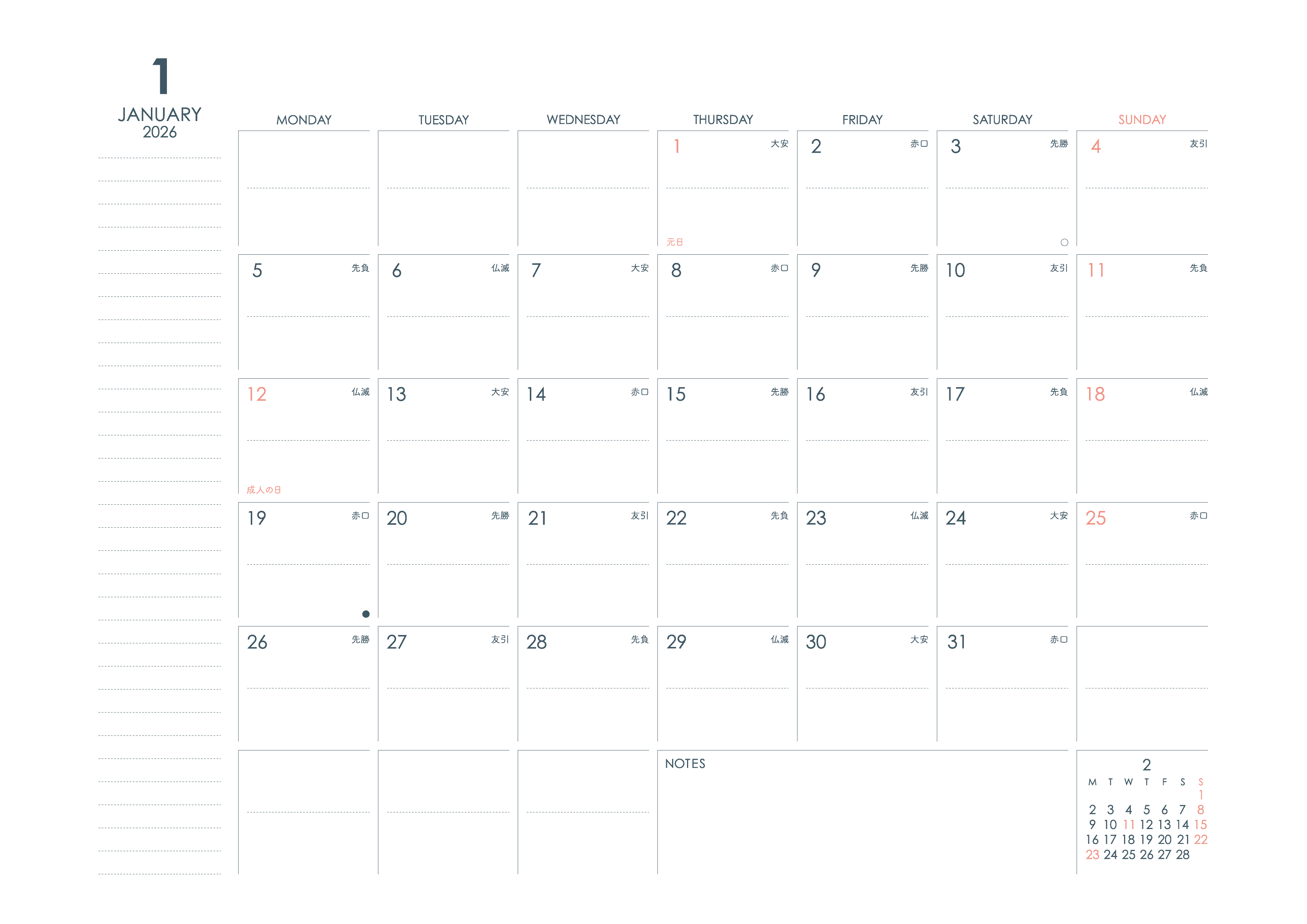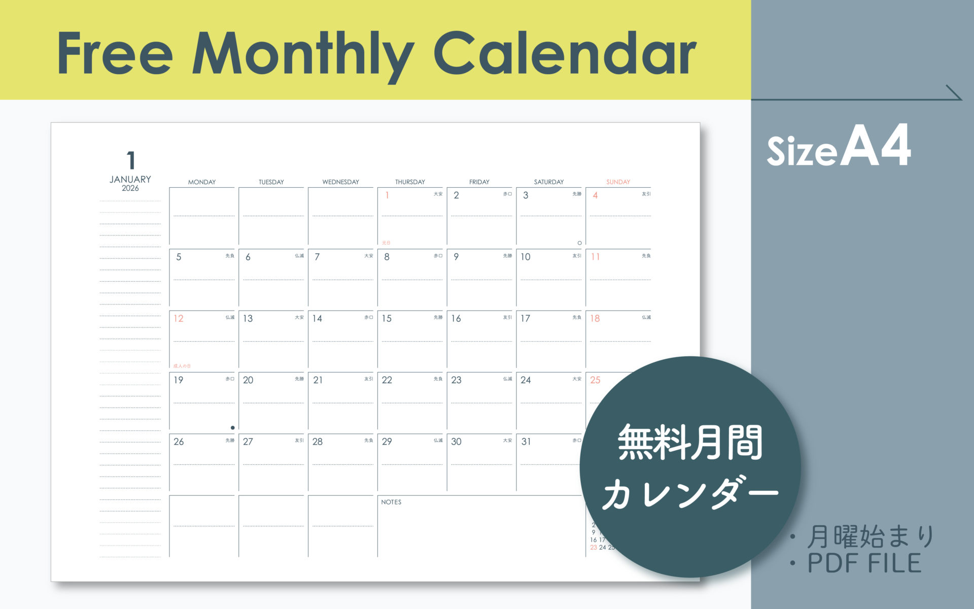 【2026】 無料マンスリーカレンダー|A4サイズ