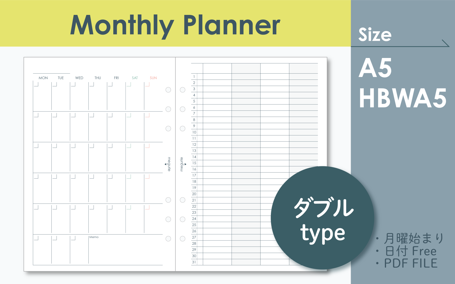 左側にスタンダードなブロックカレンダー、右側に4つの予定が書き込める横罫カレンダーのダブル使いができる月間プランナーです。