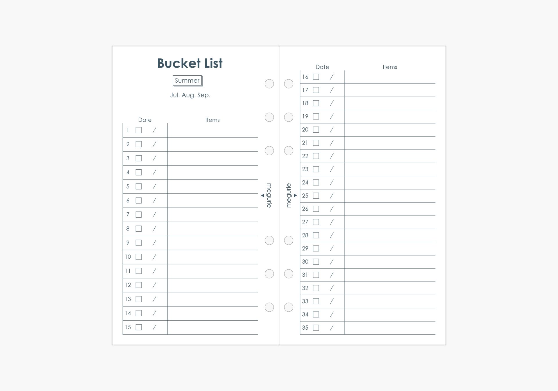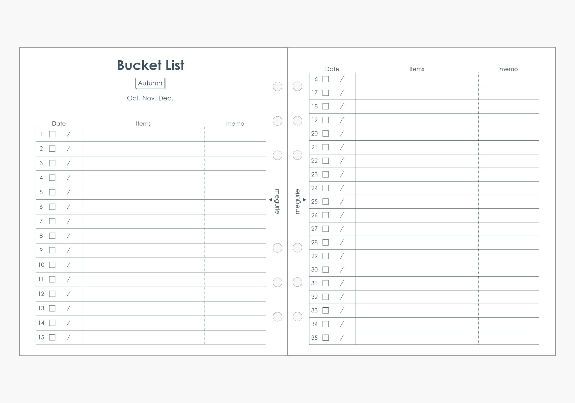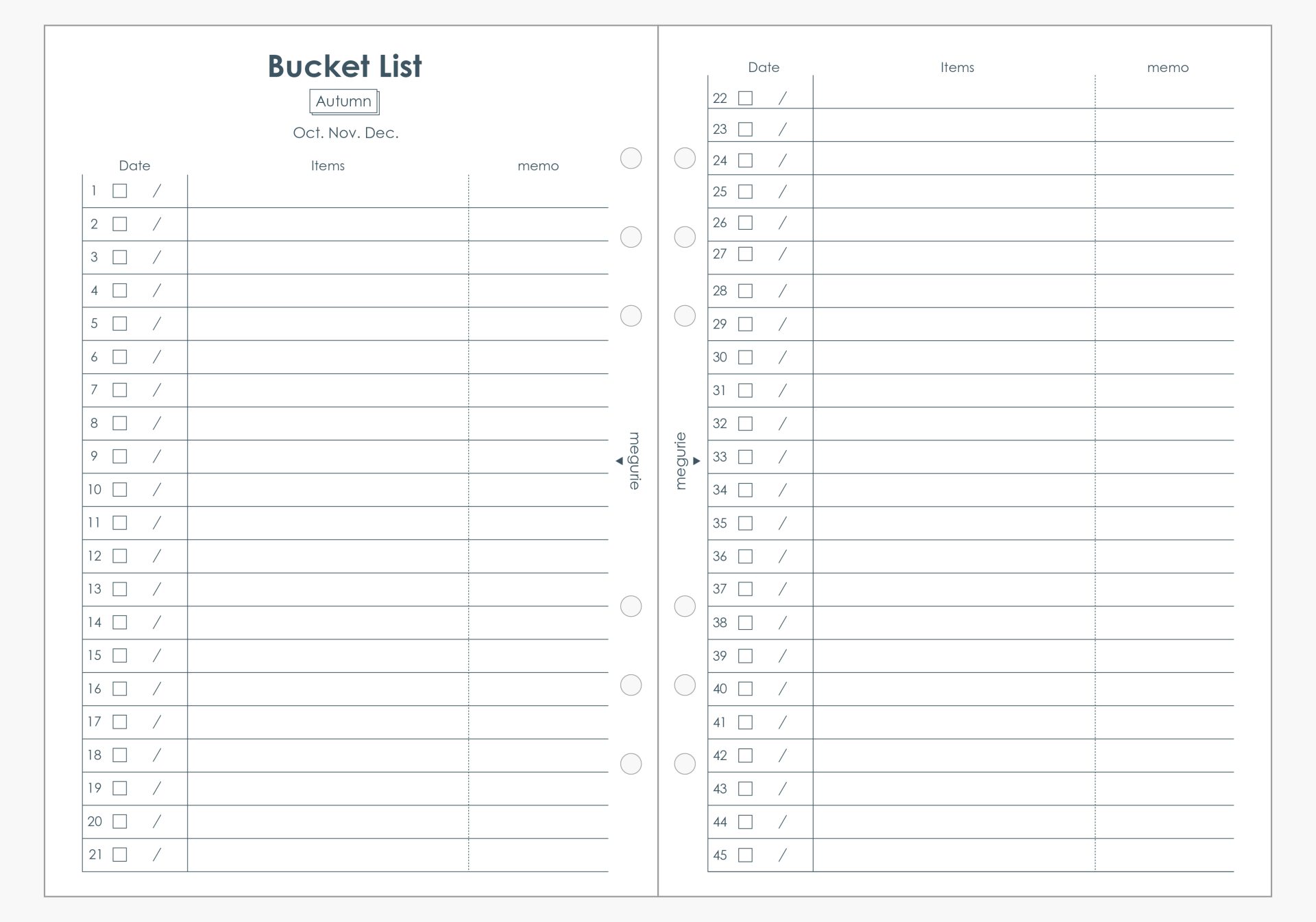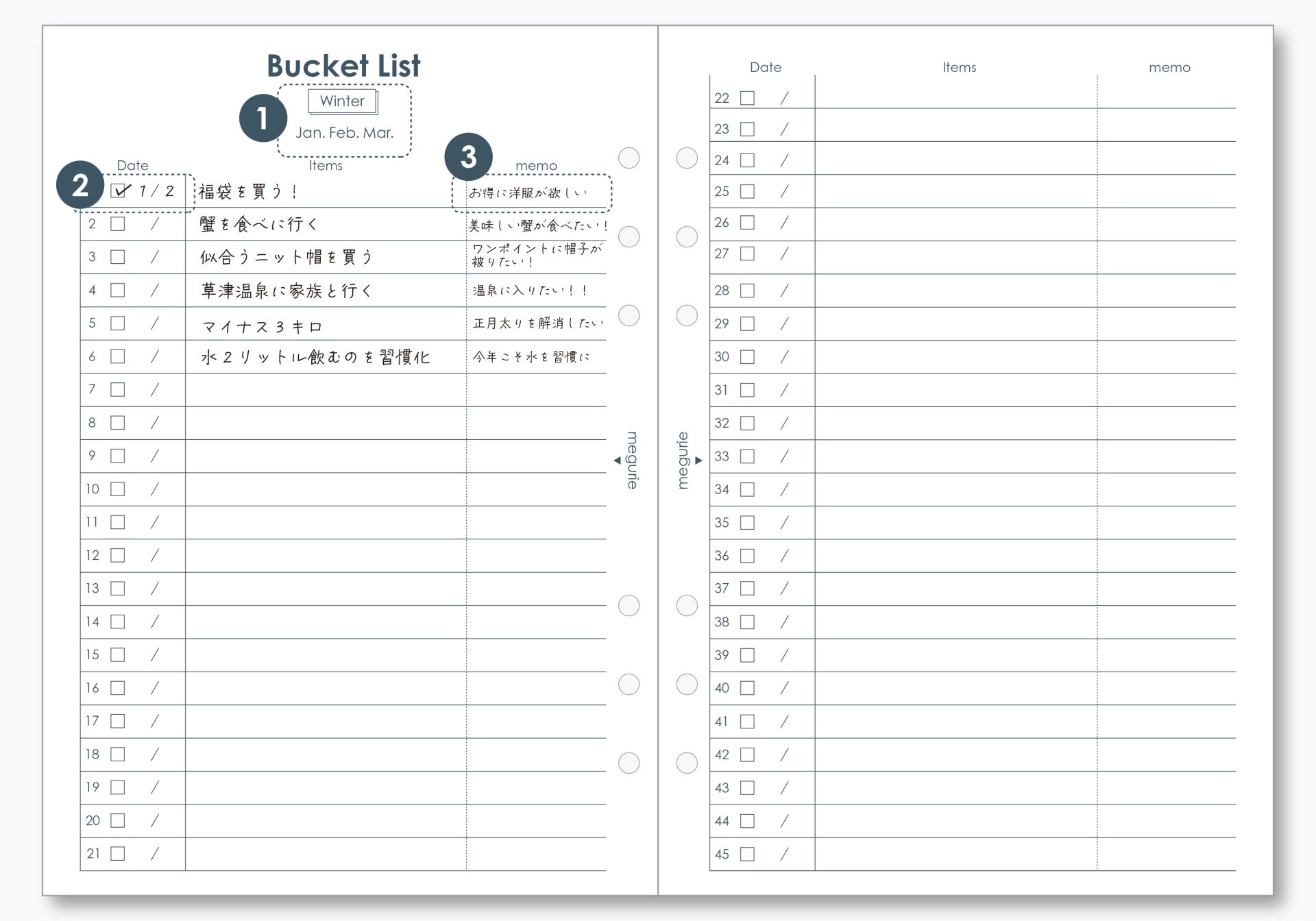 冬(1月〜3月)・春(4月〜6月)・夏(7月〜9月)・秋(10月〜12月)に自分のやりたいことを書き出すバケットリスト。季節ごとにやりたいことを考えたい方にオススメです。