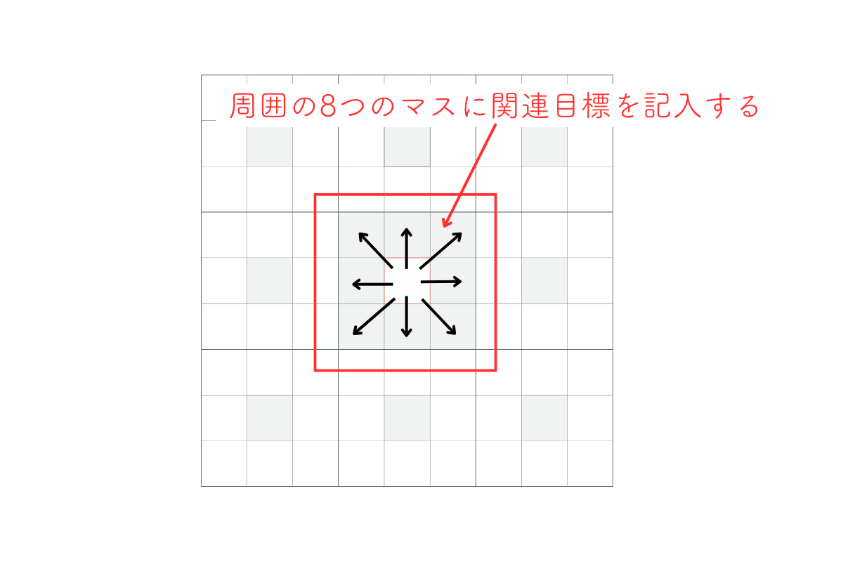 周囲の8つのマスに関連目標を記入する