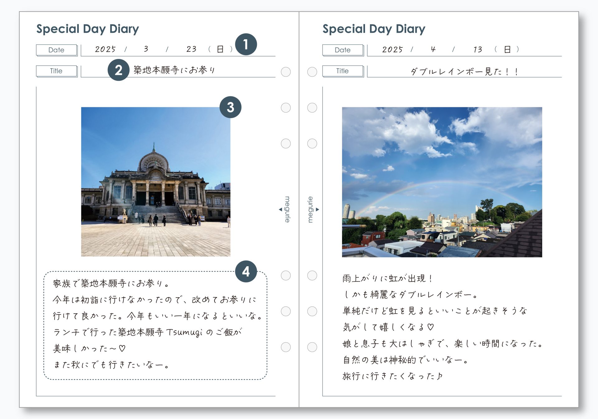 だったら、その日だけを書きませんか?日々大事ではあるけれど、記録するのは思い出に残したい時だけでいいんじゃない?そんなコンセプトでmegurieでは特別な日日記のリフィルを作っています。