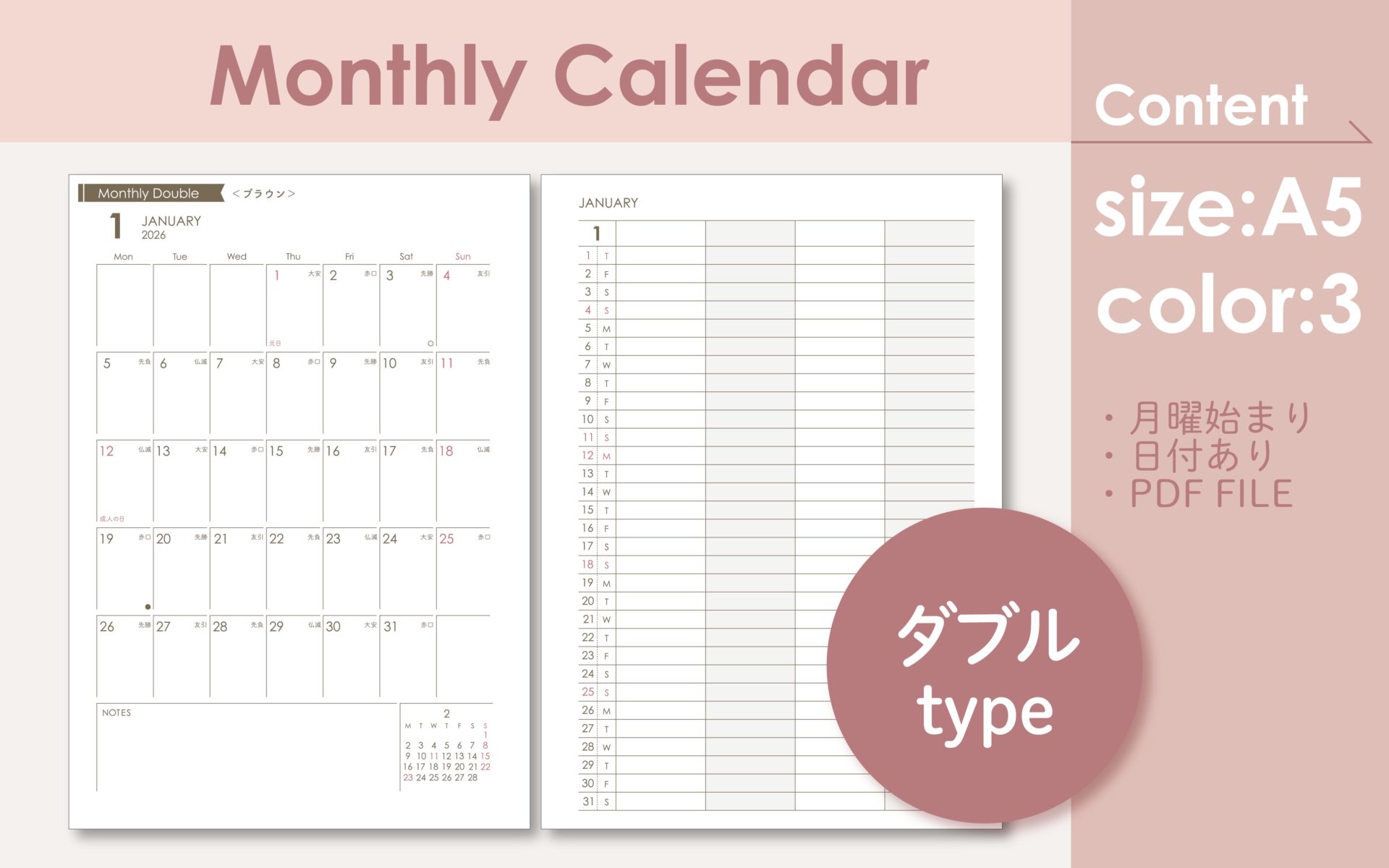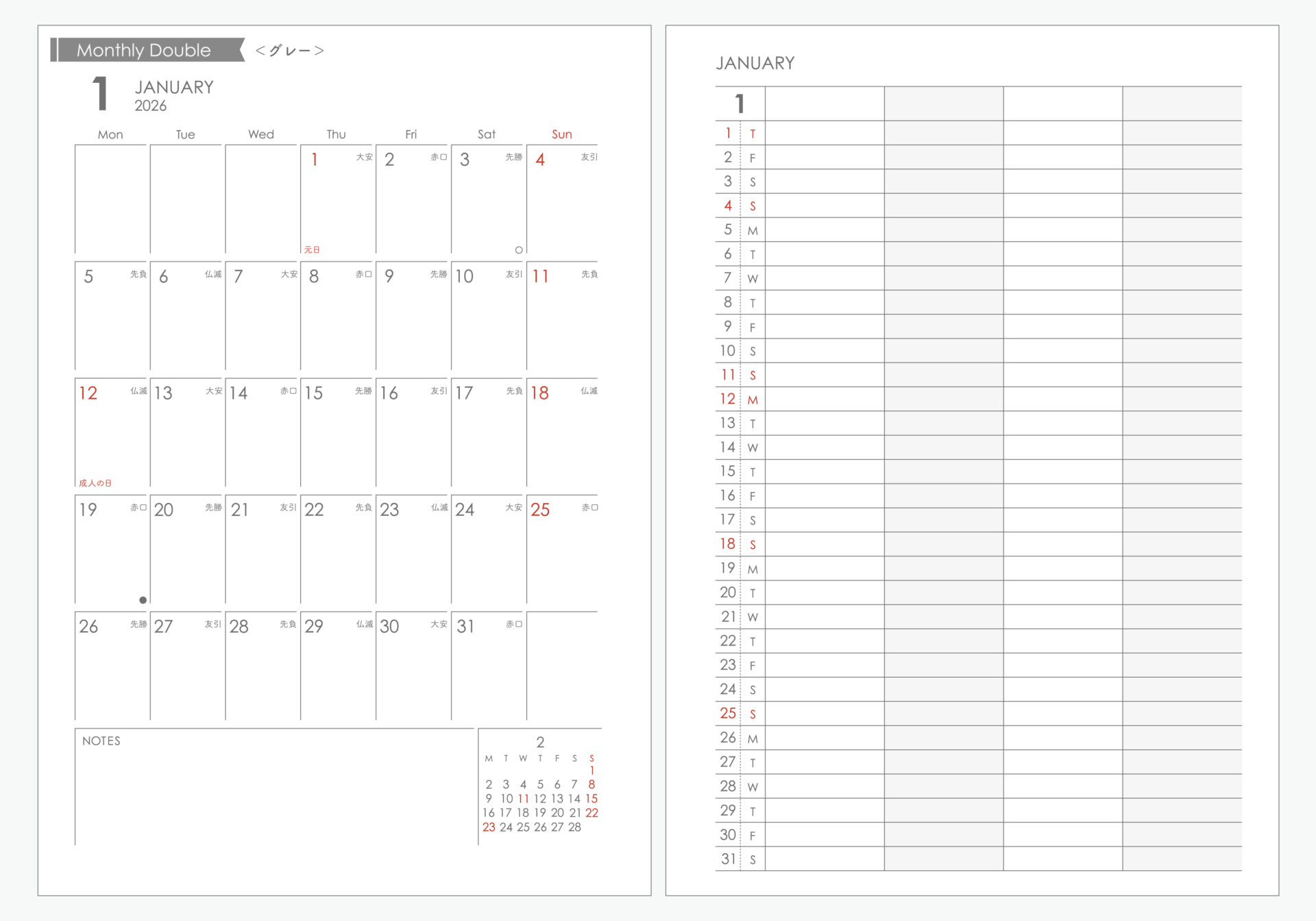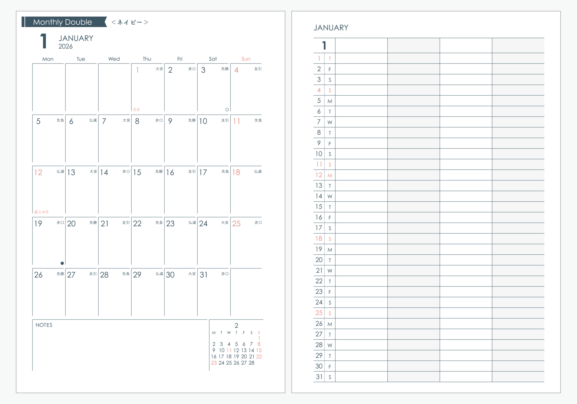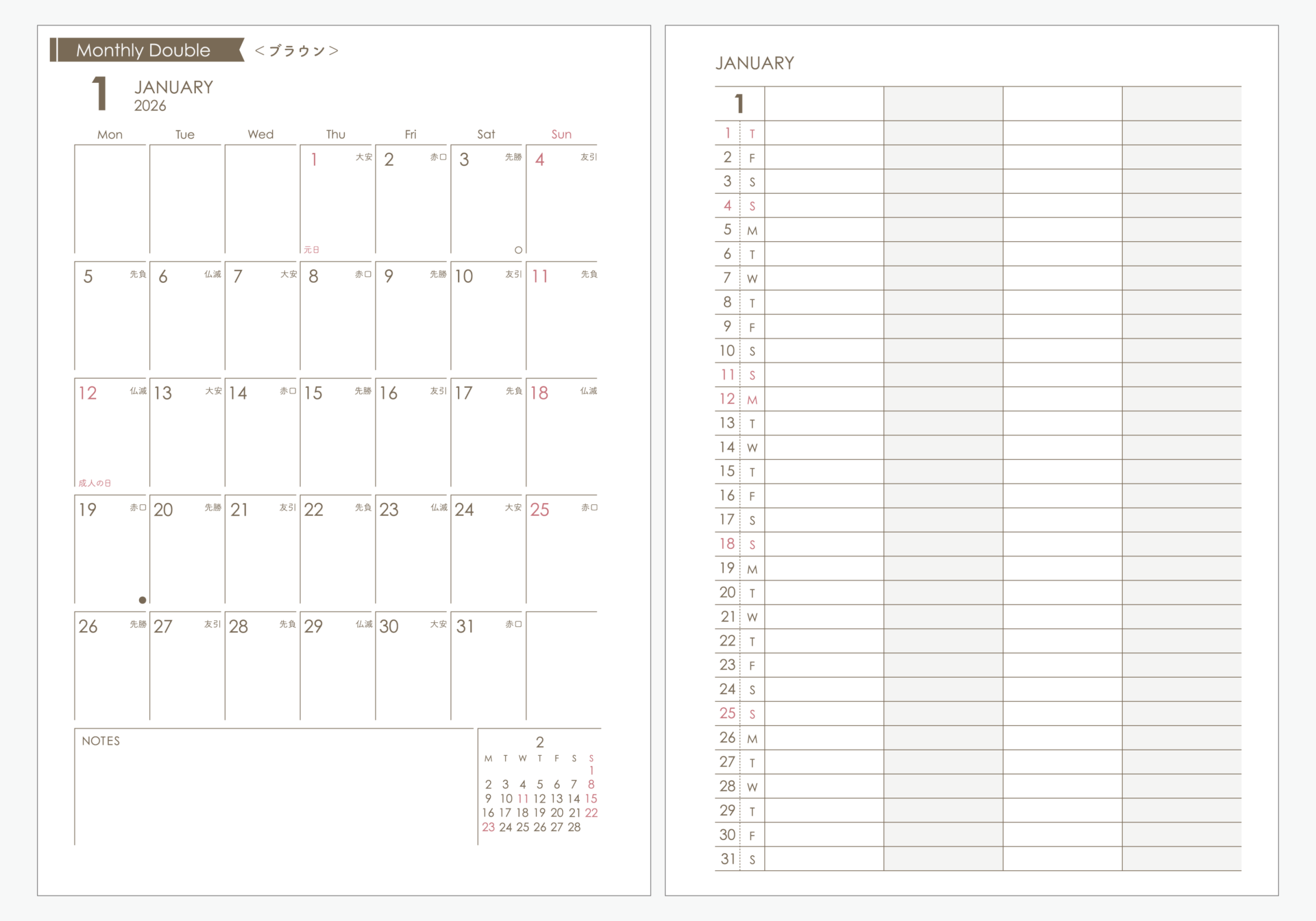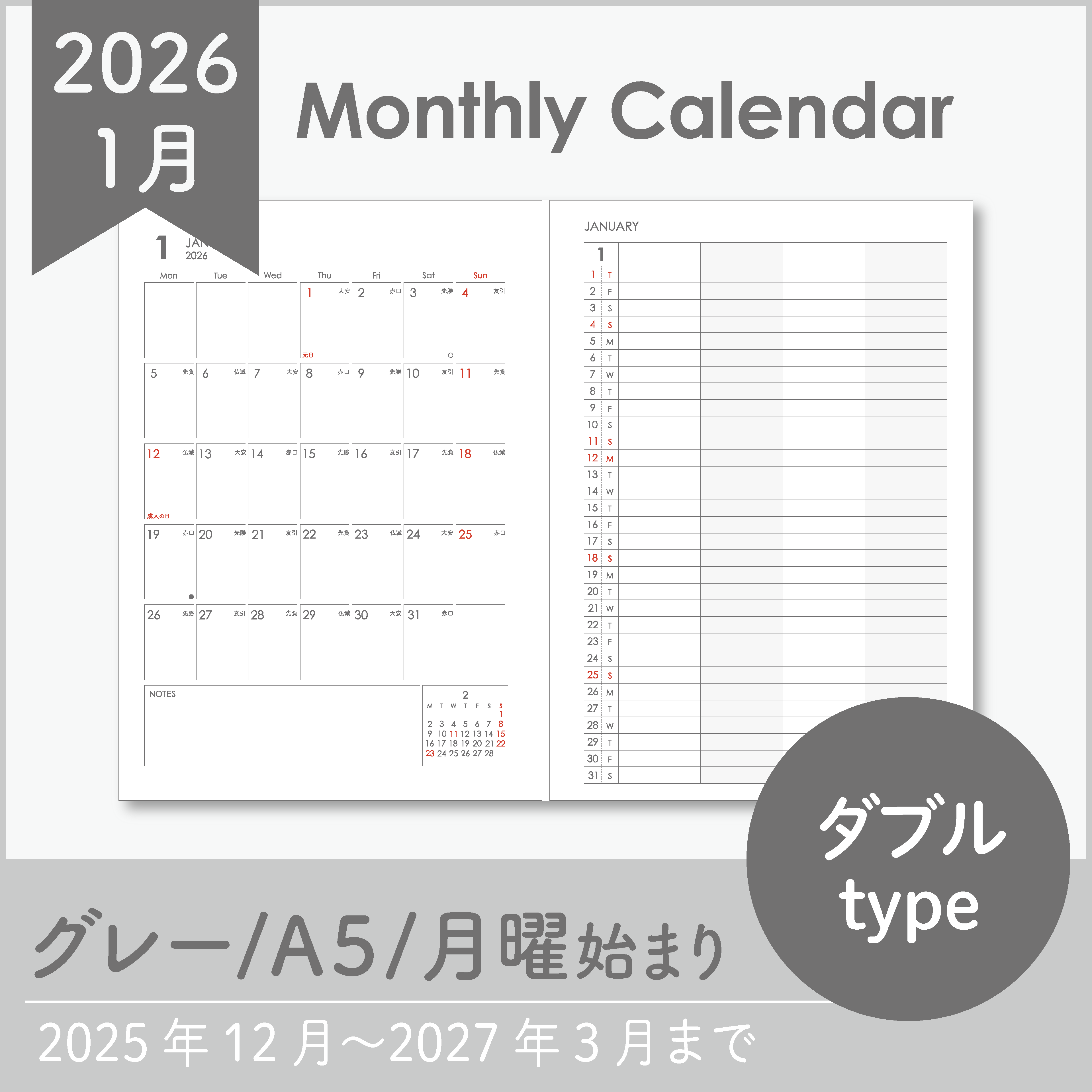 【Sample】2026年マンスリーリフィル|ダブル|システム手帳リフィル