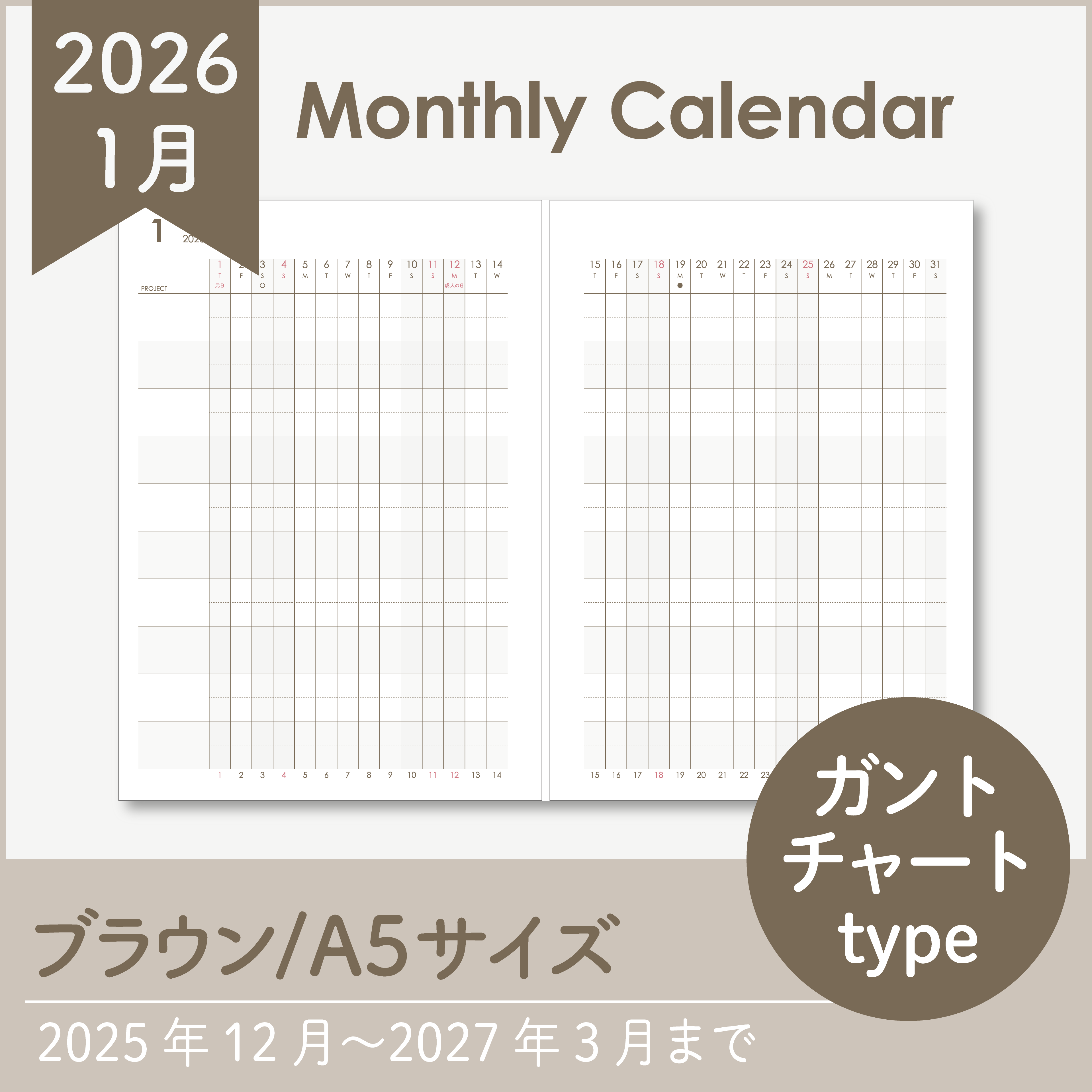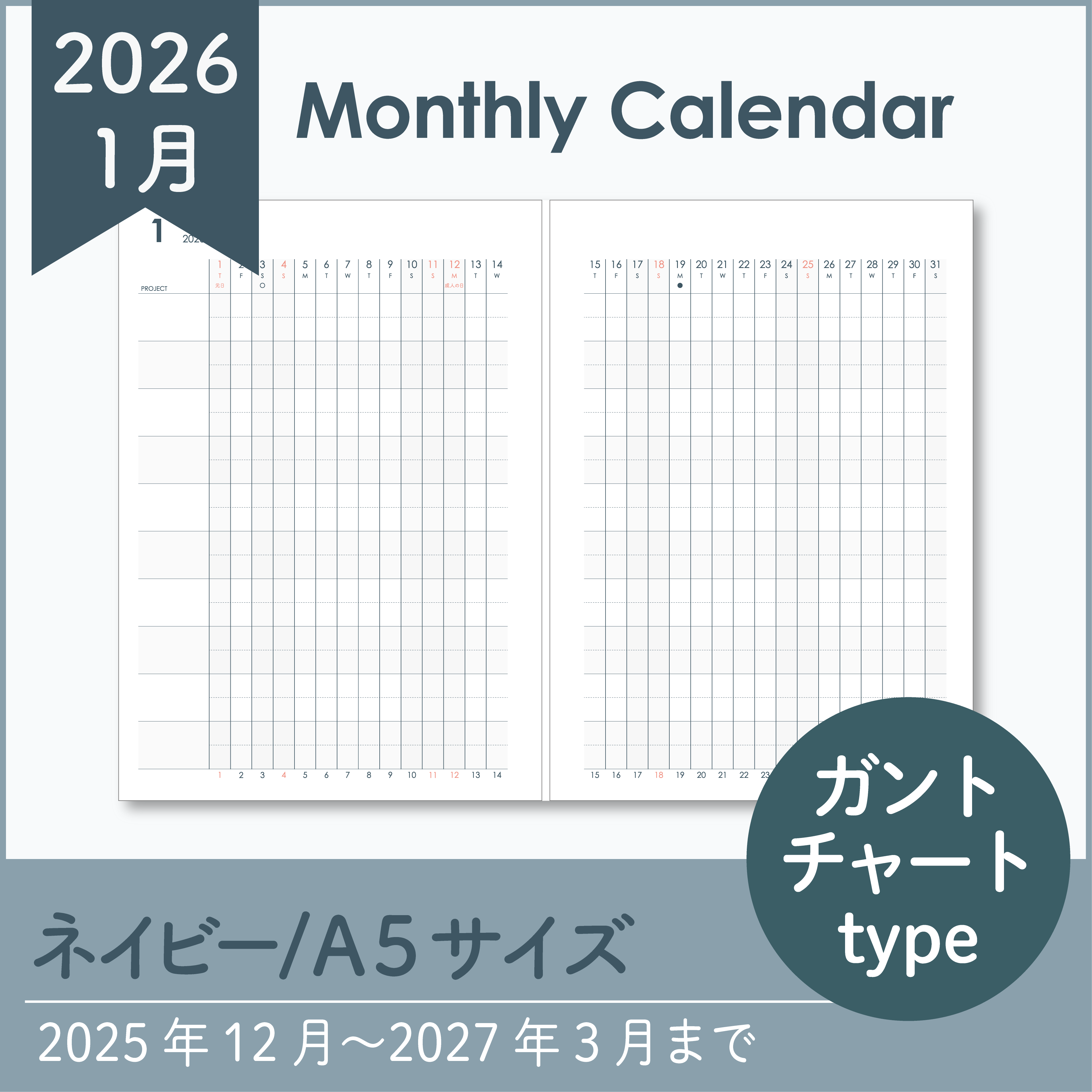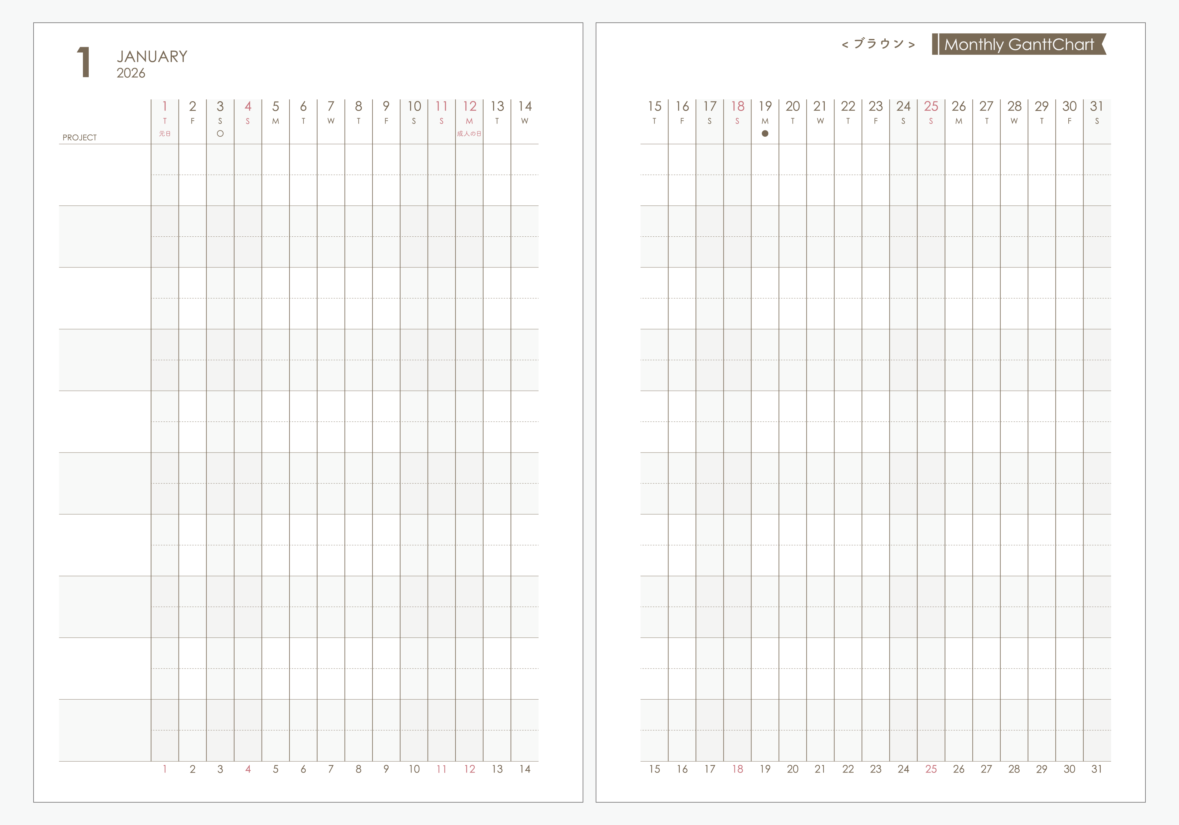 【Sample】2026年マンスリーリフィル|ガントチャート|システム手帳リフィル