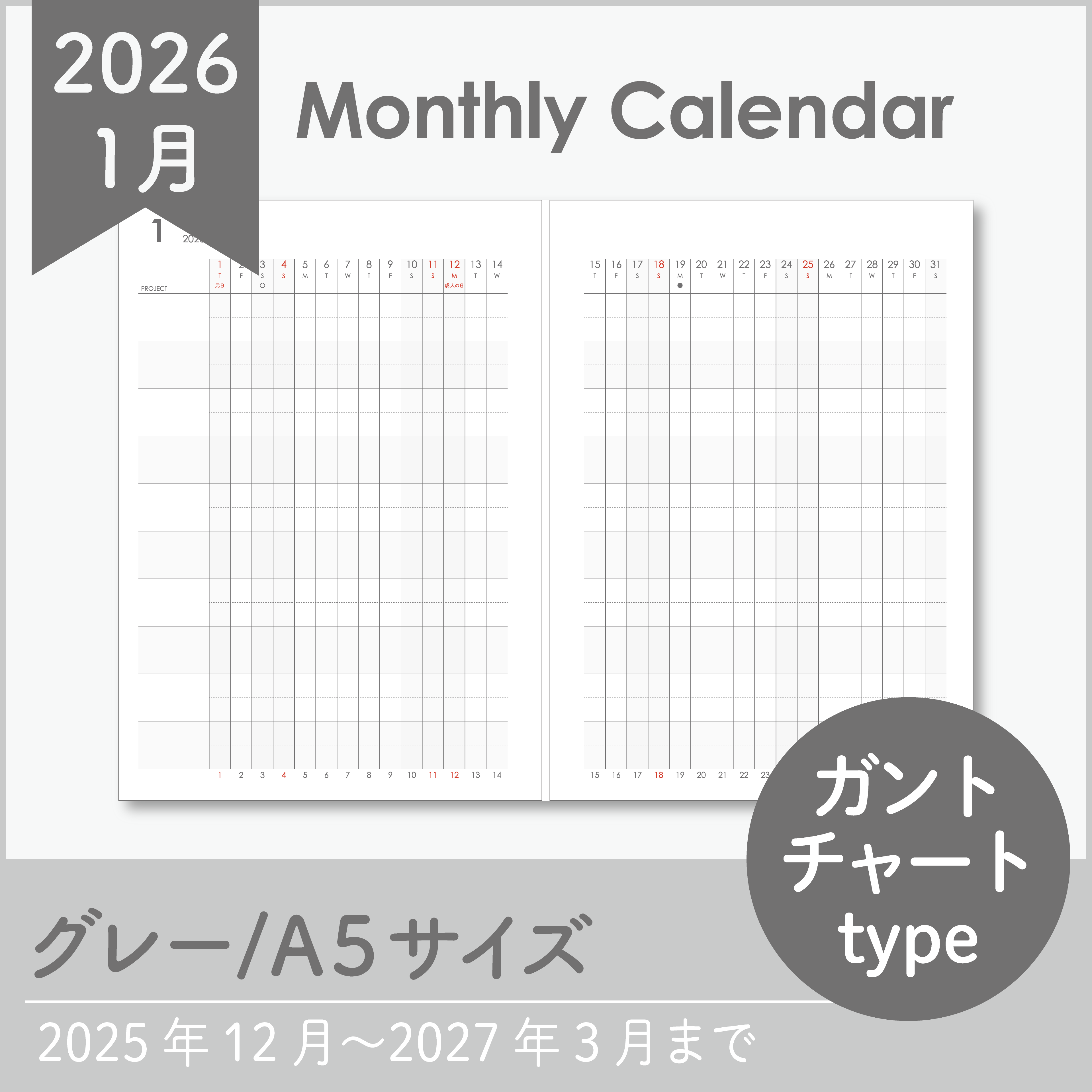 12ヶ月分の日付が入った有料版月間ガントチャートカレンダーは下記からお求めいただけます。