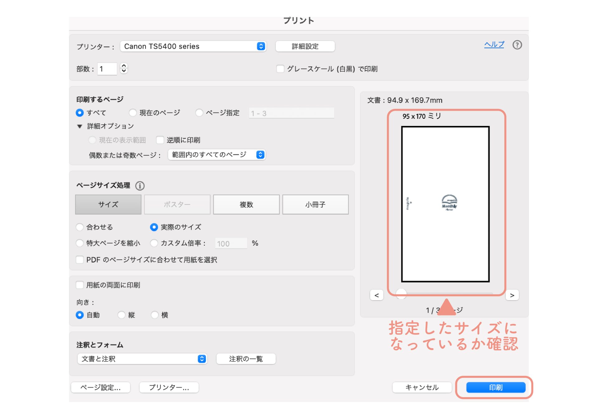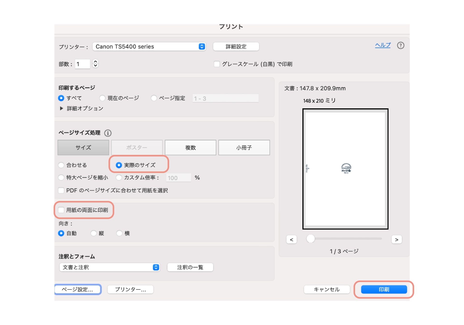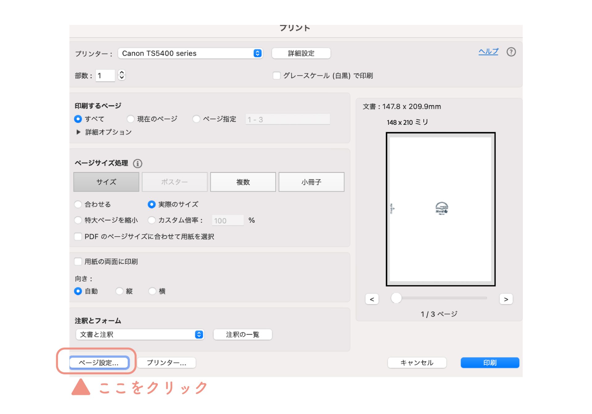 ▶︎ページサイズの【実際のサイズ】にチェックを入れる