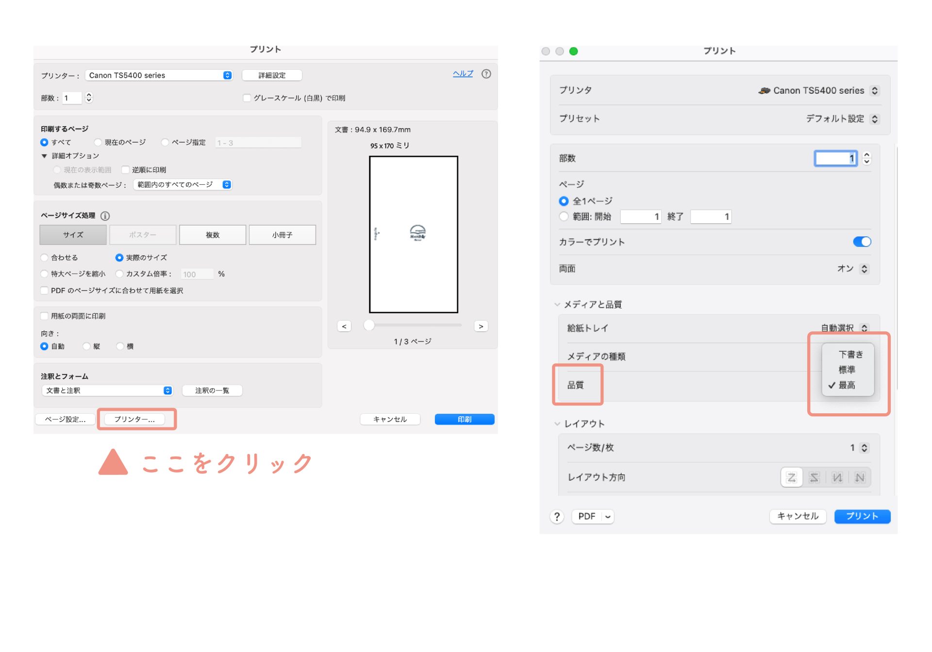 ※プリンターによって表示される項目が違いますので、お持ちのプリンター設定の中で品質設定をしてください。