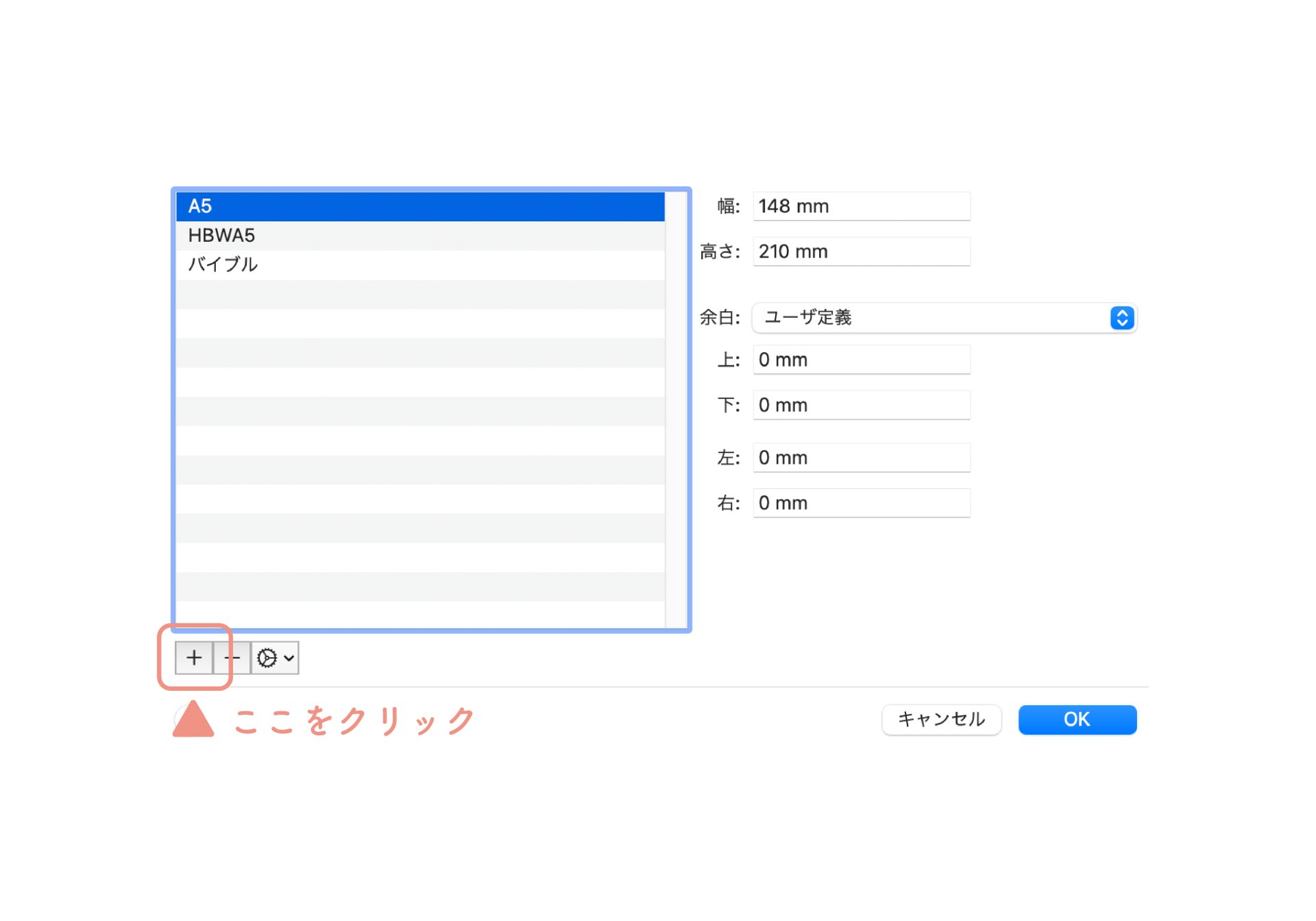 ▶︎バイブルサイズと名前をつけて、サイズを幅95mm・高さ170mmと入力してOKボタン
