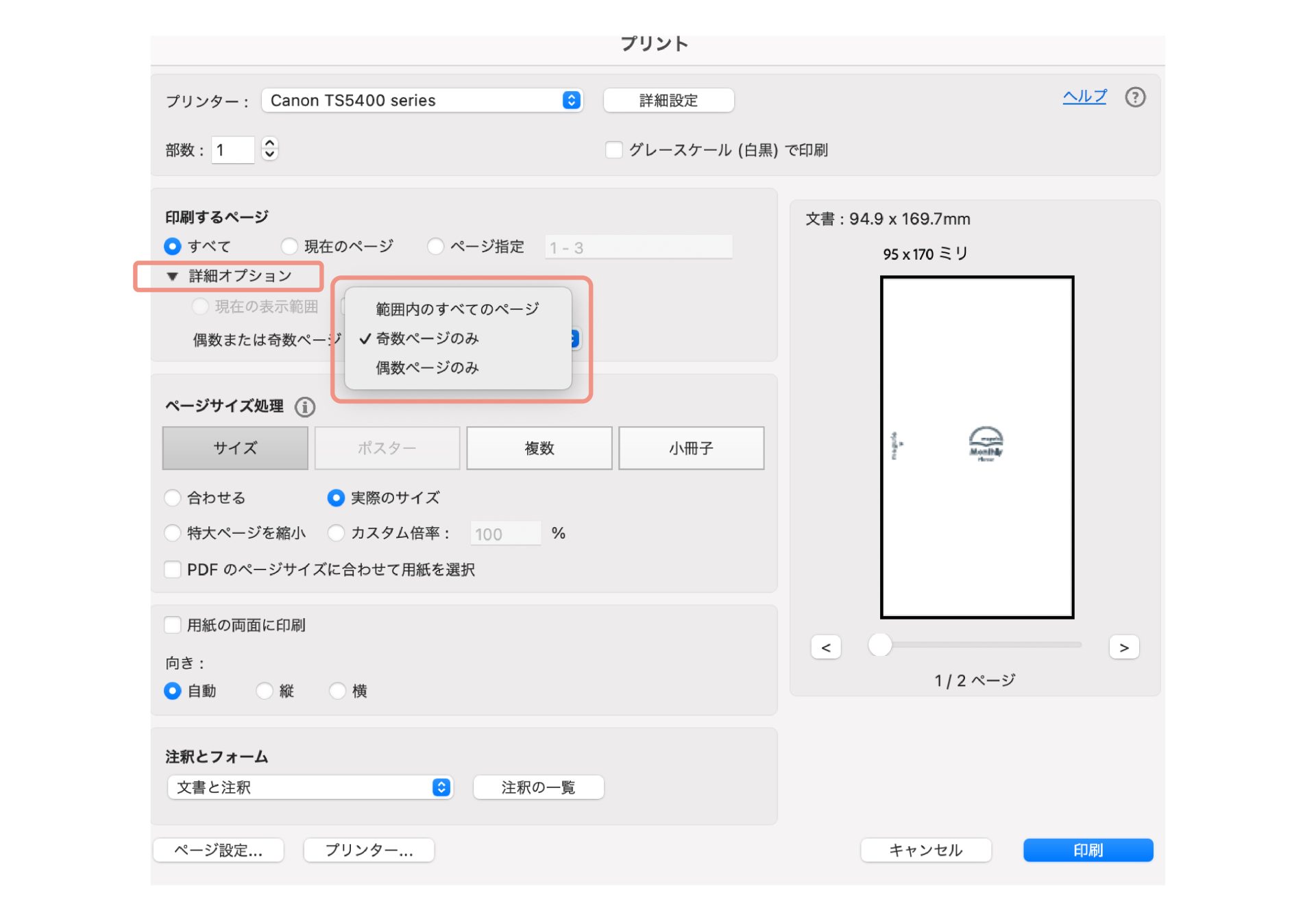印刷するページ内の【詳細オプション】から奇数 or 偶数を選ぶ