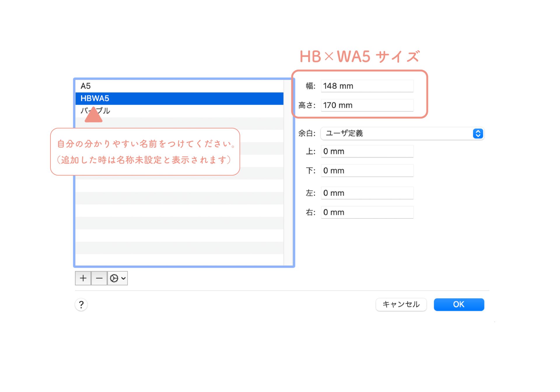 ▶︎HB×WA5と名前をつけて、サイズを幅148mm・高さ170mmと入力してOKボタン